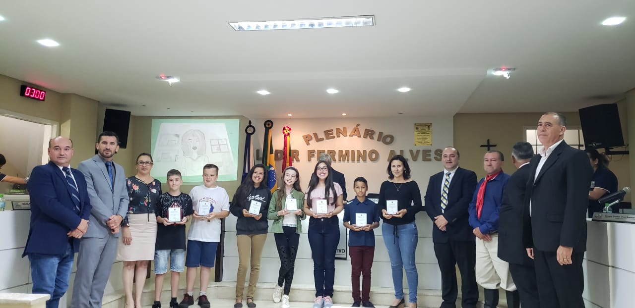 Vereadores: Valdir Machado, Cleomar Gnoatto, Luzia Barbosa Netto, Valmir Dall'Agnoll, Hanilton João Venério e Jorge Luiz Nicolau entregam a homenagem pelo terceiro lugar nacional Esquete Teatral.