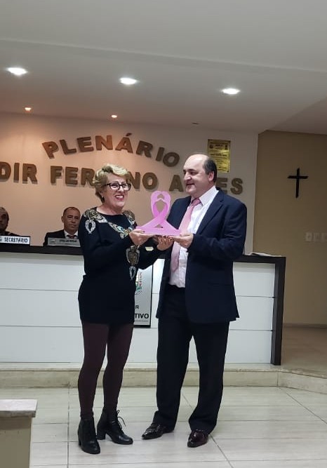 Presidente Valmir Dall’Agnol entrega homenagem a Sra. Maria Cleci Brobot.
